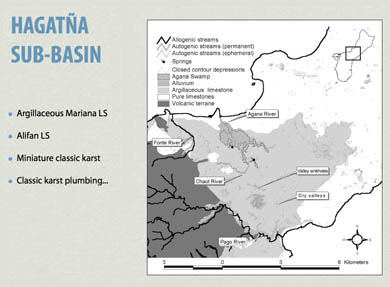 The terrain that develops on Mariana Limestone Argillaceous Member is characterized by a combination of mixed underground and surface drainage, and is a special type of karst known as fluviokarst (Taborosi & Jenson 2002). While common in continental karst, fluviokarst is uncharacteristic of carbonate islands. It exists on Guam due to argillaceous limestone's high clay content and proximity to non-carbonate terrain. The former reduces the rocks' matrix porosity and the latter promotes arrival of focused surface water flow to the limestone area. |