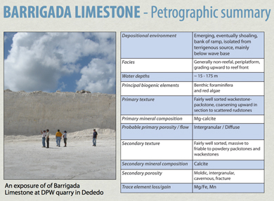 The Barrigada Limestone is a monotonous expanse of friable and very porous foraminiferal white limestone. It was deposited in deep water and constitutes most of the bedrock mass on northern Guam (Tracey et al., 1964). It contains predominantly benthis foraminiferal fossils and, in some later shallow water deposits, corals, mollusks, and algae. The rocks can be classified as wackestones through grainstones and are chalky and friable. The Barrigada Limestone averages about 8 percent pore space (Schlanger, 1964) and represents the main aquifer rock of the Northern Guam Lens Aquifer (NGLA).
