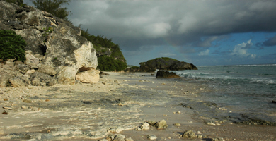 The northern Guam is the limestone plateau comprising the northern half of the island. The plateau is separated from the uplifted volcanic highlands in the southern half of the island by the large NW/SE-trending Pago-Adelup Fault. Elsewhere, the plateau is fringed by cliffs that rise precipitously over the sea or by a narrow coastal terrace. The plateau has a generally modestly-sloping, concave-upward surface, and is tilted from an elevation of about 60 m at Amantes Point at the SW to 150 m elevation at Pati Point on its NE corner and 180 m at Ritidian Point, its NW extreme. |