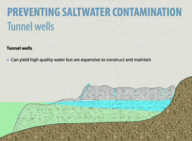 In addition to the standard drilled vertical wells, there are horizontally drilled tunnel wells. They are more expensive to construct and maintain, but yield high quality water. Due to their unique engineering and the fact that water is not extracted from a single point in the aquifer, horizontal wells are less likely to experience saltwater intrusion problems.