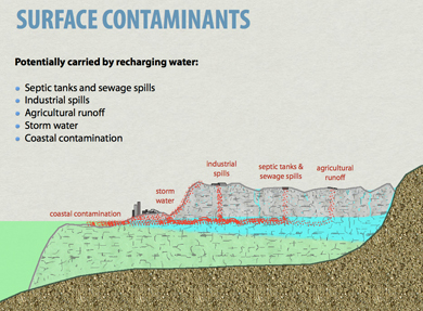 In addition to saltwater intrusion, water in the aquifer is threatened by contaminants originating from the land surface and carried by recharging water. Spills of sewage, leaks from septic tanks, industrial spills, materials washed off the land and carried by storm water, and runoff from agricultural areas all transport potentially harmful substances into groundwater that we drink. It is important to understand that because NGLA is a karst aquifer, great portion of its recharge and internal transport occurs through open fractures and conduits where water undergoes no filtering. |