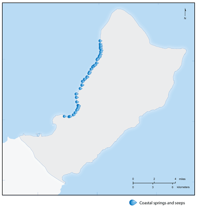 About this map:This map shows the locations of coastal springs mapped as part of a groundwater study by Jocson, J.M.U. (1998), Hydrologic model for the Yigo-Tumon and Finegayan subbasins of the Northern Guam Lens Aquifer (NGLA), Guam [MSc thesis], University of Guam, Mangilao, 95 pp. The study area spanned the coastal segment from Tumon Bay north to Falcona Beach. The original locations of springs were plotted on USGS topographic map. Flow estimation in mgd was based on visual observations. Seepage areas along the coast were also noted but are not included on this map. Further information can be found in Jocson, J. M.U. et al., (1999), Numerical Modeling and Field Investigation of Infiltration, Recharge, and Discharge in the Northern Guam Lens Aquifer (NGLA), WERI Technical Report # 88 (available from http://www.weriguam.org/reports/item/numerical-modeling-and-field-investigation-of-infiltration-recharge-and-discharge-in-the-northern-guam-lens-aquifer.html). |