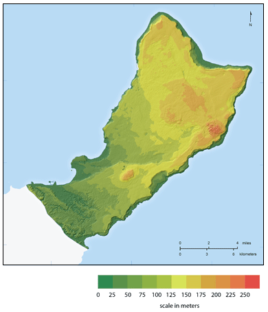 About this map:This map shows the elevation and relief of terrain in northern Guam. It was created from the 2-m resolution LiDAR-derived DEM by means of the Spatial Analysis Tool. LiDAR data were collected in 2007 by JALBTX for the Government of Guam. It consists of two separate layers: DEM classified into elevation intervals and colored and a hillshade (hypsometric tinted shaded relief) layer. This approach creates an illusion of viewing terrain in 3D, while also conveying elevation information. |