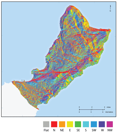 About this map:This map shows the aspect of sloping terrain in northern Guam. It uses different colors to indicate orientations that the terrain faces. It was created from the 4-m resolution LiDAR-derived DEM, by means of GIS spatial analysis techniques. LiDAR data were collected in 2007 by JALBTX for the Government of Guam. |